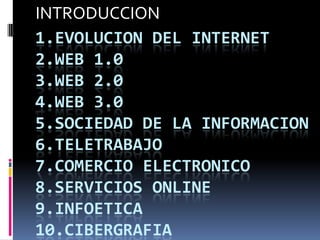 Este documento presenta una introducción a las aplicaciones web 2.0 e Internet. Explica la evolución de Internet y la Web desde la Web 1.0 hasta la Web 3.0. También cubre temas como la sociedad de la información, el teletrabajo, el comercio electrónico, los servicios en línea, la infoética y la cibergrafía.