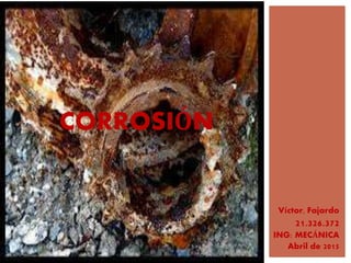 La corrosión es la destrucción de un material por una reacción química o electroquímica con el medio ambiente. Puede ser uniforme, afectando toda la superficie a igual velocidad, o localizada, afectando solo ciertas áreas. La corrosión puede ocurrir por medios químicos o electroquímicos y afecta una variedad de materiales como metales, cerámicas y polímeros. Algunos ejemplos comunes de corrosión incluyen las cañerías de agua, automóviles y electrodom