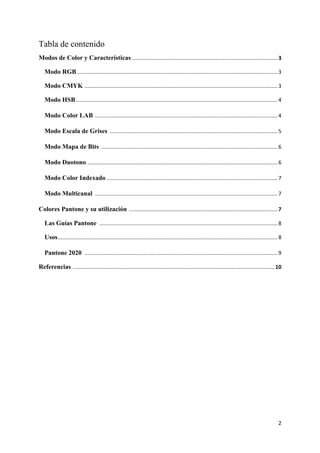 Este documento describe los diferentes modos de color que se pueden usar en diseño gráfico, incluyendo RGB, CMYK, HSB, LAB, escala de grises, mapa de bits, duotono, indexado y multicanal. También explica el sistema Pantone de identificación de colores, las guías Pantone, sus usos y el color Pantone 2020.