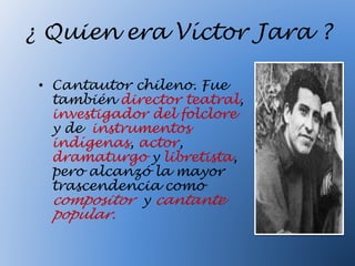 Víctor Jara fue un cantautor chileno que alcanzó fama internacional por sus canciones que trataban sobre su pueblo y sus problemas sociales. Fue detenido y torturado tras el golpe militar de Pinochet en 1973, donde le rompieron las manos y finalmente fue asesinado. Escribió su último poema "Somos cinco mil" mientras estaba preso describiendo la situación de miles de detenidos como él.