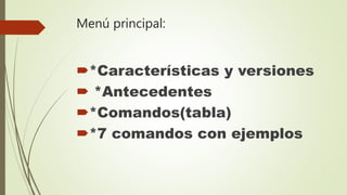El documento describe las versiones y características principales de MS-DOS. MS-DOS fue desarrollado originalmente por Digital Research y luego vendido a Microsoft. La versión 1.0 tenía 40,000 líneas de código y soportaba discos flexibles. Versiones posteriores agregaron soporte para discos duros, subdirectorios, redes y unidades de disco más grandes. El documento también enumera comandos comunes de MS-DOS como COPY, DIR, DEL, CD y sus funciones.