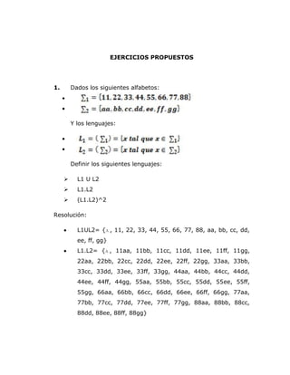 El documento presenta tres ejercicios sobre lenguajes formales y regulares. El primer ejercicio define tres lenguajes como la unión, concatenación y concatenación elevada a la segunda potencia de dos lenguajes dados. El segundo ejercicio obtiene el lenguaje regular asociado a una expresión regular dada utilizando las leyes de los lenguajes regulares. El tercer ejercicio lista cuatro cadenas palíndromas como ejemplos de palabras de un lenguaje de palíndromos sobre un alfabeto.