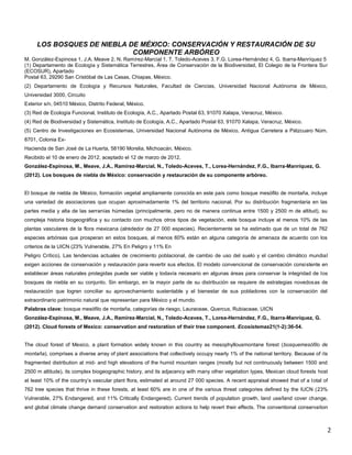 Este documento describe los bosques de niebla de México, una formación vegetal que ocupa aproximadamente el 1% del territorio nacional y alberga al menos el 10% de la flora vascular de México. Señala que de las 762 especies arbóreas que prosperan en estos bosques, al menos el 60% se encuentran en categorías de amenaza según la UICN. Explica que debido al crecimiento poblacional, el cambio de uso del suelo y el cambio climático, se requieren acciones de conservación y restauración para revertir sus