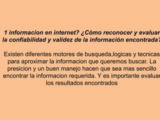 El documento habla sobre diferentes temas relacionados con la búsqueda de información en internet. Explica qué son las palabras clave que aparecen al realizar una búsqueda, cómo mejorar los resultados a través de una búsqueda avanzada utilizando criterios como el idioma o el formato, y menciona que los catálogos e índices especializados son páginas que indexan información sobre temas específicos. También describe algunas nuevas tendencias en buscadores como mostrar vistas preliminares de los sitios o clasificar los resultados por formato