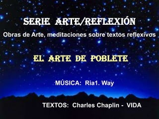 El documento presenta obras de arte del pintor chileno Gustavo Poblete junto con reflexiones del actor y director Charles Chaplin sobre la vida. Las pinturas de Poblete retratan la belleza y el realismo, mientras que los textos de Chaplin invitan a la meditación sobre temas como el perdón, el amor, la pérdida, y vivir la vida con pasión y determinación.