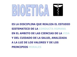 La bioética estudia la conducta humana desde la perspectiva de las ciencias de la vida y la salud, analizando temas como nacer, vivir y morir con dignidad. La bioética aborda el origen y dignidad de la vida humana desde la concepción, así como las culturas de la vida y de la muerte.