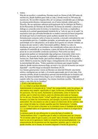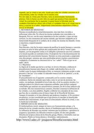 Sócrates vivió en Atenas entre 469-399 a.C. y se dedicó a enseñar filosofía a través del diálogo y la mayéutica, buscando definir conceptos como la justicia y la valentía. Creía que la virtud podía enseñarse porque la maldad proviene de la ignorancia. Fue acusado de corromper a la juventud y condenado a muerte, aunque pudo haber huido prefirió obedecer las leyes. Tuvo gran influencia en Platón y Aristóteles y sentó las