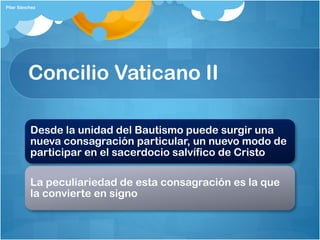 Este documento resume las principales características de la vida consagrada según el Concilio Vaticano II. La vida consagrada es un don de Dios que tiene reconocimiento eclesial y su raíz en Cristo. Hace presente a la Iglesia mediante la práctica de los consejos evangélicos y recuerda que el pueblo de Dios no tiene morada permanente en este mundo.