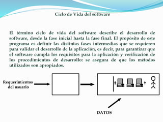 El documento describe varios modelos de ciclo de vida de desarrollo de software, incluidos el modelo cascada, incremental, evolutivo, espiral, concurrente y V. También explica los pasos generales para el desarrollo de software, como el análisis de requisitos, diseño, programación, pruebas e implementación. Además, enumera las herramientas y actividades comunes involucradas en el proceso de desarrollo de software.
