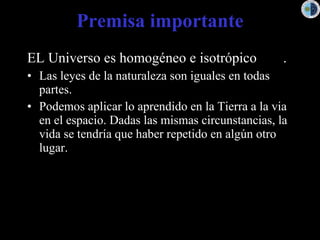 El documento discute la posibilidad de vida extraterrestre y las condiciones necesarias para su desarrollo. Argumenta que dado que las leyes de la física son universales, y que hay muchos planetas similares a la Tierra, es probable que la vida se haya desarrollado en otros lugares. También analiza factores como la composición química necesaria, la presencia de agua, y las zonas de habitabilidad alrededor de las estrellas para el surgimiento y evolución de la vida.