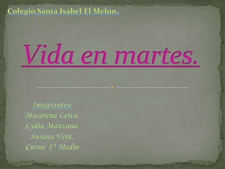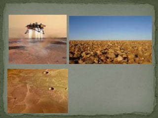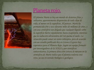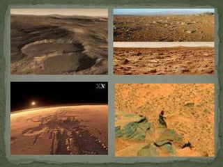 El documento presenta información sobre Marte. Describe que antiguamente tuvo agua líquida en su superficie y atmósfera, aunque hoy es un planeta frío y seco. Recientemente se detectó metano en la atmósfera de Marte, indicando actividad geológica o biológica. El documento también analiza cómo el agua y el viento moldearon el relieve marciano y cómo soluciones minerales podrían haber mantenido el agua en estado líquido a pesar de las bajas temperaturas.
