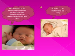 Este documento resume partes de la vida de la persona desde su nacimiento hasta el presente. Nació en septiembre de 1993 y le gustaba dormir. Aprendió a caminar a los 1 años y 6 meses y su primera palabra fue "mama". Asistió a la escuela primaria y secundaria en México y Estados Unidos, donde aprendió inglés. Actualmente asiste al Colegio de Bachilleres No. 8.
