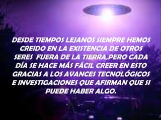 El documento habla sobre el descubrimiento de microorganismos en la estratosfera que podrían ser de origen extraterrestre. Un grupo de investigadores de la Universidad de Sheffield encontró formas de vida al analizar datos de un globo enviado a la estratosfera. El director del trabajo afirma que los microorganismos no son de la Tierra sino del universo, ya que no habido erupciones que pudieran haberlos impulsado en los últimos 3 años. Los microorganismos se encontraron a 27 km de altitud durante una lluvia de estrellas, lo