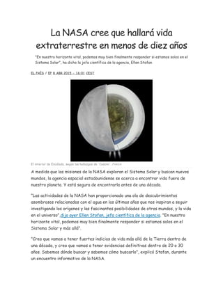 La NASA confía en encontrar vida extraterrestre en menos de diez años, dada la evidencia de agua en varios cuerpos celestes como Encélado y Marte. Ellen Stofan, la jefa científica de la agencia, señala que muestran indicios de vida y que conocen dónde y cómo buscar. Las investigaciones actuales, incluidas las misiones de Cassini y Dawn, sugieren que los océanos bajo la superficie de lunas heladas y otros planetas podrían tener los ingredientes necesarios para la vida.