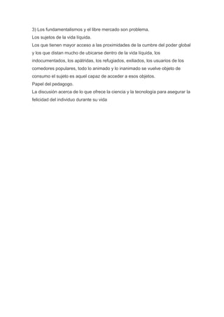 Este documento discute la "vida líquida" en el contexto tecnológico moderno. La vida líquida se refiere a un mundo en constante cambio donde las condiciones cambian más rápido que las formas de comportamiento puedan consolidarse. Esto da origen a incertidumbre e inestabilidad. El documento también analiza dos perspectivas sobre el uso de la tecnología: una que prioriza la tecnología sobre los valores humanos, y otra que la usa de forma humanista y reflexiva. Finalmente, discute el papel del pedag