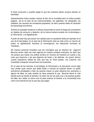 Este documento resume el concepto de "vida líquida" de Zygmunt Bauman y cómo se aplica a la sociedad contemporánea. La vida líquida se refiere a que las condiciones y relaciones cambian rápidamente en lugar de consolidarse, creando incertidumbre. También discute cómo la tecnología y el consumismo dominan, convirtiendo a las personas en objetos desechables. Finalmente, argumenta que los conceptos de Bauman son relevantes para México, donde la vida líquida domina y las personas aceptan estilos de vida impuestos.