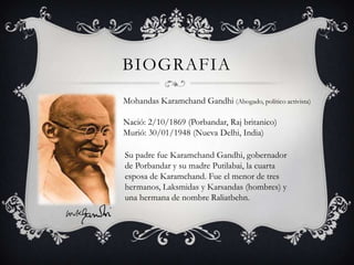 Mohandas Karamchand Gandhi nació en 1869 en la India británica y fue un líder político y activista que luchó por la independencia de la India a través de la no violencia y la desobediencia civil. En 1930, lideró la famosa Marcha de la Sal para protestar contra el monopolio británico de la sal. A pesar de pasar su vida defendiendo la no violencia, Gandhi fue asesinado en 1948. Continúa siendo reconocido por sus logros en la independencia de la India y por promover la dignidad humana.