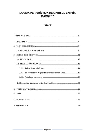 Este documento presenta una breve biografía de Gabriel García Márquez, destacando aspectos clave de su vida que influyeron en su obra periodística y literaria. Creció en Aracataca, Colombia, influenciado por las historias de su abuelo. Estudió derecho pero se dedicó al periodismo y la literatura. Trabajó como periodista en Colombia y Venezuela, y sus crónicas periodísticas se convertirían en libros famosos. Su novela Cien Años de Soledad lo llevó a la fama mundial en 1967. Garc