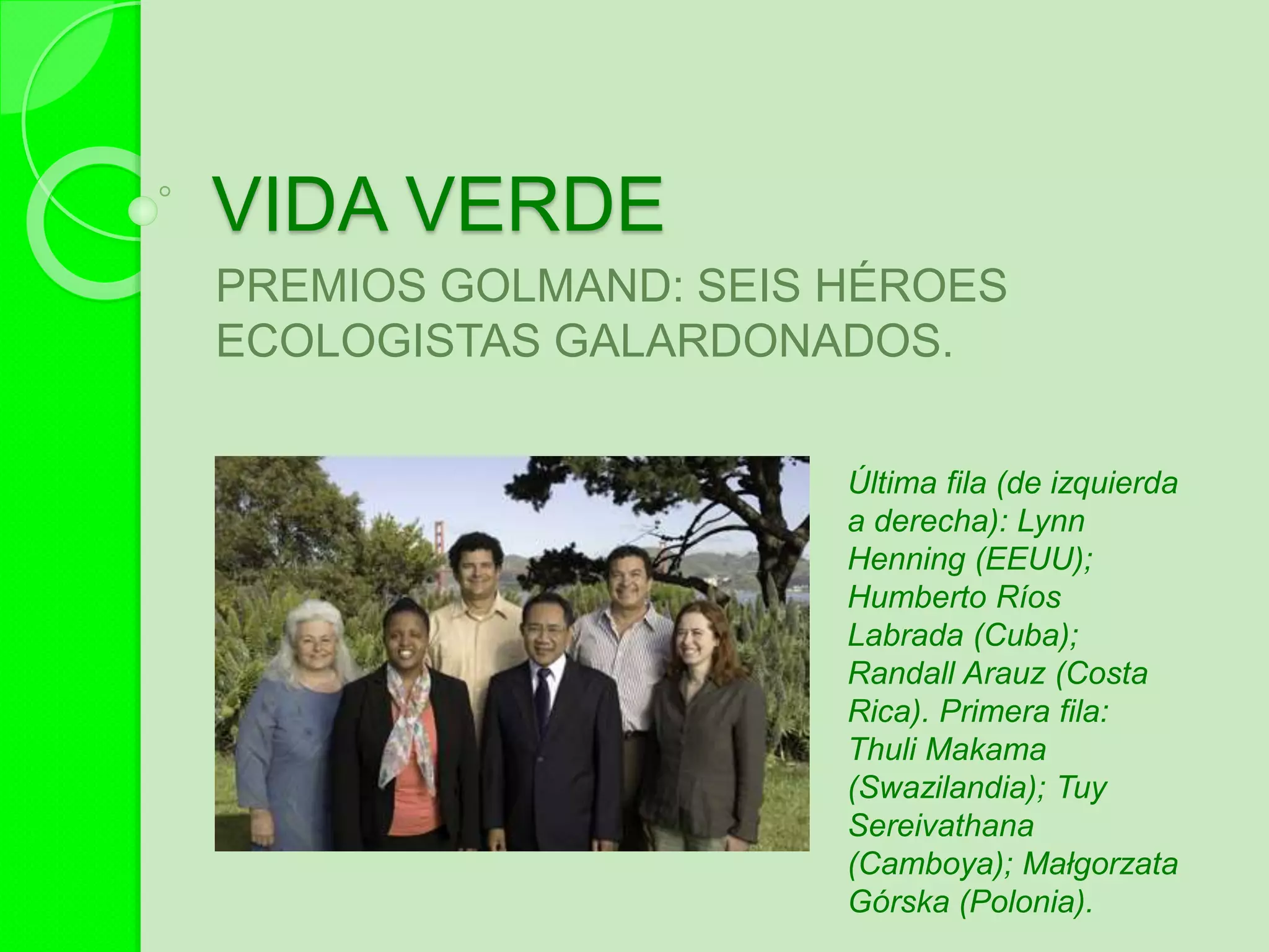 Este documento presenta a seis ecologistas galardonados con el Premio Goldman por su trabajo en la protección del medio ambiente: Randall Arauz de Costa Rica, Humberto Ríos Labrada de Cuba, Lynn Henning de Estados Unidos, Thuli Makama de Swazilandia, Tuy Sereivathana de Camboya y Małgorzata Górska de Polonia. Cada uno ha realizado importantes contribuciones en áreas como la conservación de especies marinas, la agricultura sostenible, la protección del agua y la participación de las comunidades locales en