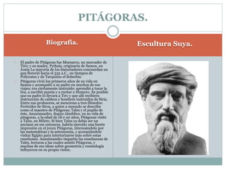 Pitágoras fue un filósofo y matemático griego del siglo VI a.C. que nació en la isla de Samos y recibió educación de destacados filósofos como Tales y Anaximandro. Pitágoras enseñaba que la Tierra estaba en el centro del universo y descubrió las leyes de los intervalos musicales. Aunque algunas de sus ideas sobre la posición de la Luna y la Tierra no eran completamente precisas, anticipó importantes descubrimientos astronómicos como la identidad de Venus como estrella de la mañana