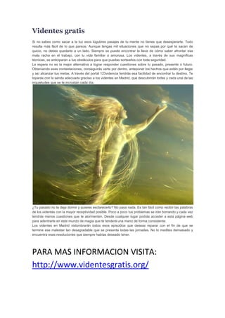Este documento promueve los servicios de videntes gratuitos que pueden ayudar a las personas a superar problemas en el trabajo, la familia o las relaciones mediante la anticipación de obstáculos y la respuesta a preguntas sobre el pasado, presente y futuro. Ofrece acceso a videntes en Madrid a través de un portal web para que las personas encuentren su destino y resolución a inquietudes mediante palabras de magia y ayuda consistente.