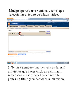 Subir un video a un blog requiere 3 pasos: seleccionar el icono de añadir video, buscar y seleccionar el video en el ordenador asignándole un título, y hacer clic en subir video.