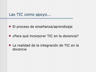 Las TIC comoapoyo... El proceso de enseñanza/aprendizaje ¿Para qué incorporar TIC en la docencia? La realidad de la integración de TIC en la docencia