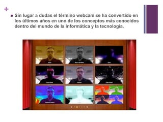 Este documento describe una cámara web, incluyendo sus características principales como capturar imágenes y video para transmitir a través de Internet, sus partes como el visor digital y el cable de datos, y recomendaciones de uso como la videoconferencia y transmitir eventos en vivo.