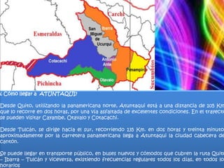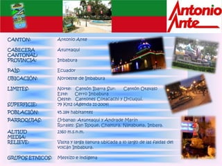 El documento proporciona información sobre el cantón de Atuntaqui en Ecuador. Se encuentra ubicado en la provincia de Imbabura, en el noroeste del país, y limita con otros cantones. Tiene una superficie de 79 km2 y una población de 45,184 habitantes. Sus principales actividades económicas son la industria textil y la artesanía. Es también un destino turístico que ofrece atracciones culturales como la ex fábrica textil y eventos como el carnaval.