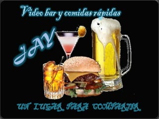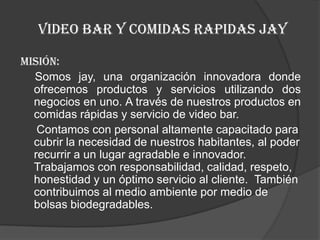 Jay es una organización que ofrece comidas rápidas y servicio de video bar en Sonso, Valle del Cauca, Colombia. Su misión es brindar productos y servicios innovadores a través de personal capacitado para satisfacer las necesidades de la comunidad. Su visión es expandirse rápidamente en la región para generar empleos y ayudar a familias necesitadas mediante eventos especiales. Sus valores corporativos son la calidad, responsabilidad, honestidad y servicio al cliente.