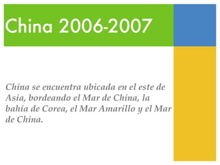 El documento describe la historia y situación política y religiosa de China. China ha sido una gran civilización por siglos pero enfrentó inestabilidad en los siglos 19 y 20. Después de 1949, los comunistas bajo Mao establecieron un sistema estricto que aseguraba la soberanía pero limitaba libertades. Desde 1978 hubo más enfoque en una economía libre. Hoy China es gobernada por el Partido Comunista ateo que controla estrictamente la religión a través de leyes que prohíben actividades no aprobadas.