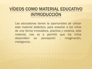 Este documento discute el uso de videos como material educativo en la educación inicial. Señala que los videos permiten enseñar a los niños de manera innovadora y creativa al desarrollar su percepción, imaginación e inteligencia. El objetivo es fomentar la curiosidad y actitud indagadora de los niños a través de programas interactivos que impulsan la educación tecnológica.