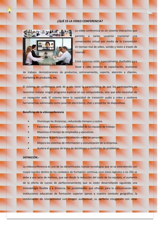 La videoconferencia permite mantener conversaciones virtuales en tiempo real a través de video, audio y texto entre usuarios distantes. Ofrece beneficios como reducir tiempos y costos de viaje, aumentar la productividad y participación entre equipos distribuidos. Requiere hardware, software, una buena conexión a internet y habilidades técnicas para su uso efectivo.