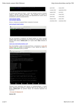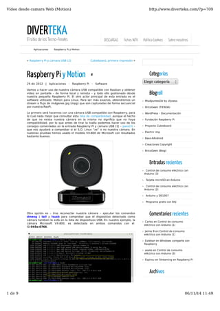 Este documento describe cómo configurar y usar el software Motion en una Raspberry Pi para obtener video en vivo desde una cámara web USB conectada. Explica cómo instalar y configurar Motion, ajustar parámetros como la resolución y frecuencia de captura, y acceder al flujo de video desde la propia Raspberry Pi o desde otros dispositivos de la red local a través de una dirección URL en el navegador.