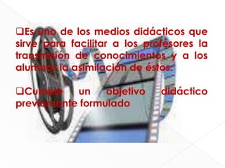 Un video educativo sirve para facilitar la transmisión de conocimientos de los profesores a los alumnos y la asimilación de estos. Existen cuatro tipos de videos educativos: curriculares, de divulgación cultural, científico-técnicos, y para la educación. Los videos también se pueden clasificar por sus objetivos: instruccionales, cognoscitivos, motivadores, modelizadores, y lúdicos. Los videos educativos permiten el seguimiento del progreso del estudiante, la comunicación interpersonal, el trabajo colabor
