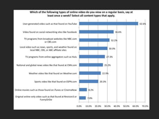 El uso de video online se ha convertido en un fenómeno global, con el 80% de los usuarios de Internet que ven video en línea. Los usuarios de YouTube ven un promedio de 96 videos por mes. Aunque los jóvenes siguen siendo los principales consumidores de video generado por usuarios, la demografía se está expandiendo a audiencias más amplias y maduras. El video en línea mejora la capacidad de un sitio web para posicionarse en los motores de búsqueda y aumenta el tiempo que los usuarios pasan en un sitio. Se prevé que el trá