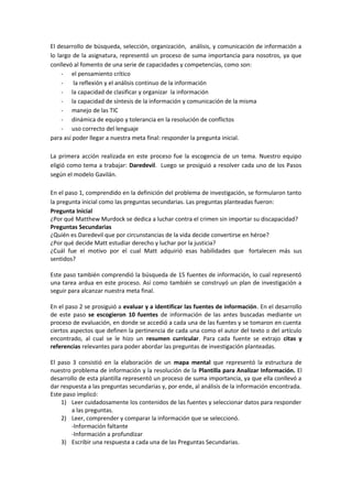 El documento resume el proceso de investigación realizado por un equipo sobre el personaje Daredevil. El proceso incluyó 5 pasos: 1) definir preguntas de investigación, 2) evaluar fuentes, 3) crear un mapa mental y analizar la información, 4) sintetizar la información para responder las preguntas, y 5) comunicar los resultados a través de un ensayo y presentación oral. El equipo investigó por qué Daredevil lucha contra el crimen a pesar de su discapacidad visual.