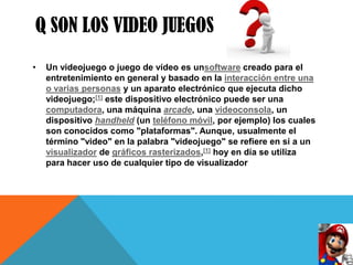 Los videojuegos son software creado para el entretenimiento que involucra interacción entre personas y dispositivos electrónicos como computadoras o consolas. Aunque pueden tener beneficios educativos si se usan con supervisión, también tienen posibles desventajas como adicción, conducta violenta o rechazo a otros medios. Existen clasificaciones como el ESRB para determinar la edad a la que están dirigidos los juegos.