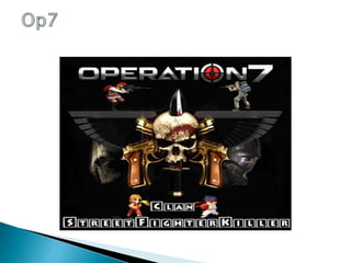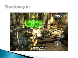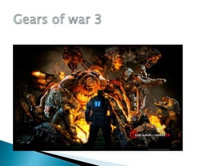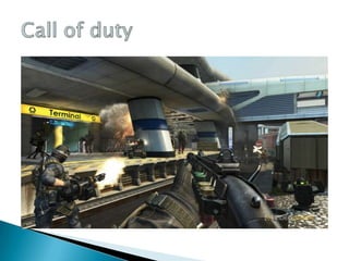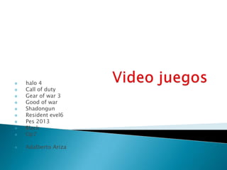 Este documento resume brevemente varios videojuegos populares como Halo 4, Call of Duty, Gears of War 3, God of War, Resident Evil 6, PES 2013, Call of Duty: Black Ops y Operation 7, describiendo sus características principales como género, desarrollador, fecha de lanzamiento y plataformas.