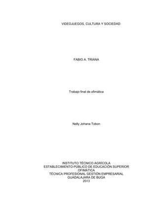 Este documento analiza la relación entre los videojuegos, la cultura y la sociedad. Explica brevemente la historia de los videojuegos y cómo se han convertido en una parte importante de la cultura popular. También discute cómo los videojuegos han influenciado otras industrias como el cine y cómo se han convertido en un gran fenómeno económico, generando más ingresos que la industria cinematográfica. El documento concluye que, si se usan adecuadamente, los videojuegos no necesariamente tienen efectos negativos