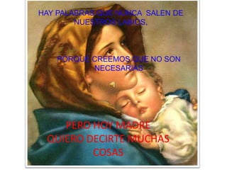 Este poema es una carta de amor de una hija a su madre, expresando cuánto la extraña y necesita. La hija recuerda con cariño la niñez junto a su madre y los consejos y regaños que le daba por amor. Agradece a su madre por todos los esfuerzos y sacrificios que hizo para criarla, aunque ya no esté presente siempre la llevará en su corazón.