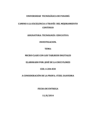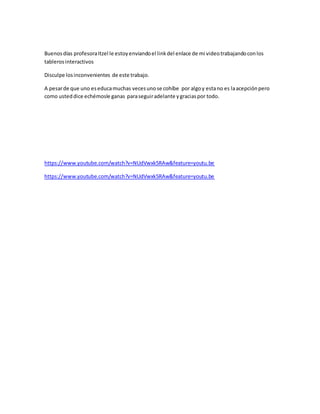 El documento presenta un informe de una micro clase sobre el uso de tableros digitales interactivos. El estudiante José de la Cruz Flores envía el enlace de un video a su profesora Itzel Saavedra mostrando cómo utilizó un tablero interactivo en clase y disculpándose por cualquier inconveniente, a la vez que agradece sus esfuerzos por mejorar la enseñanza.