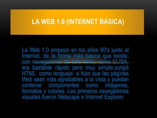 El documento describe las diferentes generaciones de la web. La Web 1.0 comenzó en la década de 1960 con navegadores de solo texto y luego adoptó HTML para permitir imágenes y formatos. La Web 2.0 se refiere a una segunda generación basada en redes sociales, blogs y wikis que fomentan la colaboración entre usuarios. La Web 3.0 combina la inteligencia humana y de las máquinas para proporcionar información más rica y relevante a través de lenguajes y algoritmos más potentes. La Web 4.0 se bas