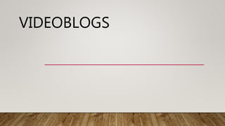 Videoblogs consisten en una galería de clips de video ordenados cronológicamente donde los autores pueden hablar sobre cualquier tema y permitir comentarios de otros usuarios. Los videoblogs son más ligeros y de corta duración que la televisión, aunque su calidad de imagen es menor. Para crear un videoblog, se debe elegir un tema, grabar y editar videos, seleccionar una plataforma como Youtube o Vimeo, añadir descripciones y promocionarlos para interactuar con la audiencia.