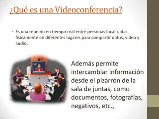 Un videoconferencia permite reunir personas en diferentes lugares para compartir video, audio y datos en tiempo real. Existen tres modalidades principales: sistemas de sobremesa para grupos pequeños, sistemas para PC para dos personas, y sistemas de sala para grandes grupos. El equipo básico incluye líneas telefónicas, tarjetas de video y sonido, y una cámara. El software gestiona el proceso de comunicación y configura los recursos. Las videoconferencias tienen aplicaciones varias como educación, medicina, y reuniones de negocios