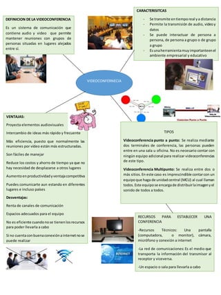 La videoconferencia permite mantener reuniones entre grupos de personas en lugares alejados mediante la transmisión de audio y video en tiempo real. Ofrece ventajas como la reducción de costos y tiempo de viaje, pero requiere recursos técnicos como pantallas, cámaras, micrófonos e internet de alta velocidad. Existen dos tipos principales: videoconferencia punto a punto entre dos lugares y multipunto entre más de dos sitios usando un equipo central.