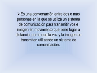 La videoconferencia permite comunicación a distancia entre dos o más personas mediante transmisión de voz e imagen en tiempo real utilizando sistemas de comunicación. Se usa para reuniones ejecutivas, simposiums, diplomados, estudios financieros, coordinación de proyectos y diagnósticos médicos. Los sistemas de videoconferencia interactivos consisten tradicionalmente en un codec, equipo de acceso a red, red y sistemas de entrada y salida de audio y video.