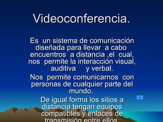 Este documento presenta una introducción a la videoconferencia. Explica que la videoconferencia permite la comunicación visual, auditiva y verbal entre personas en distintos lugares del mundo siempre que cuenten con equipos compatibles y enlaces de transmisión. Los objetivos de la videoconferencia incluyen compartir información, intercambiar puntos de vista y mostrar documentos, imágenes y videos en tiempo real. La videoconferencia también se puede usar con fines educativos como ofrecer demostraciones y capacitación a distancia.