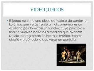 Este documento discute tres puntos sobre los videojuegos independientes. Primero, describe el juego de Daniel Benmergui como un pasillo estrecho sin texto o contexto donde el jugador avanza. Segundo, contrasta este enfoque minimalista con las tendencias cinemáticas de las grandes consolas. Tercero, argumenta que los mejores juegos como Braid usan los recursos propios de los videojuegos en lugar de cinemáticas para generar una reacción emocional en el jugador.
