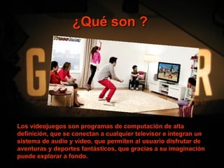 Los videojuegos son programas de computación de alta definición que permiten a los usufructuarios explorar aventuras y deportes fantásticos. Se usan principalmente para entretenimiento por niños, adolescentes y adultos. Los niños y jóvenes usan videojuegos a diario después de la escuela y en los fines de semana, ya sea individualmente o en grupo. Existen videojuegos para todas las edades y géneros.